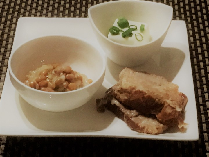 わさび豆腐、いか納豆、自家製厚切りチャーシューの一例です。